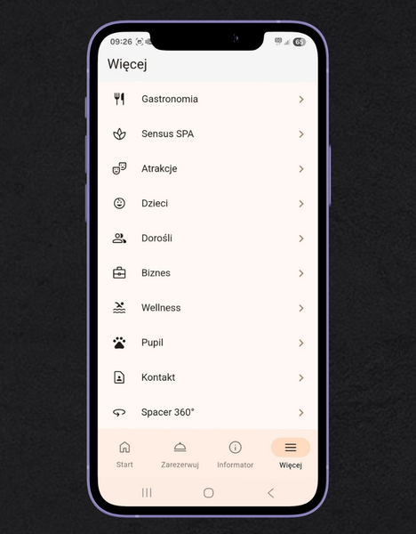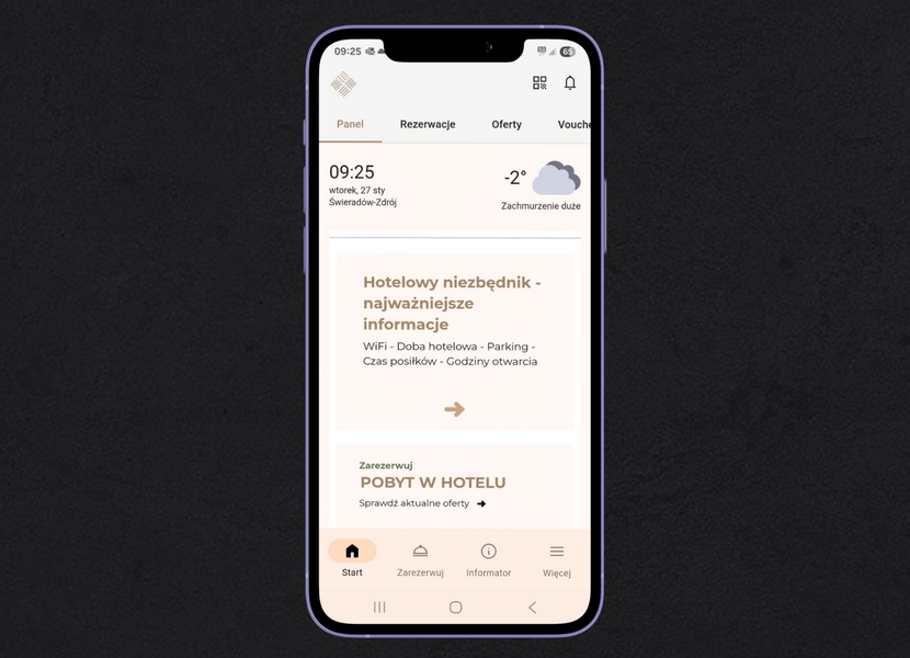 Zapewnia szybki i przejrzysty dostęp do szczegółowych informacji dotyczących rezerwacji, umożliwia zdalny check-in oraz łatwe opłacanie pobytu - wszystko bez konieczności wizyty w recepcji.